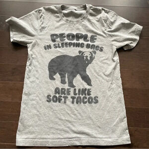 People in sleeping bags are like soft tacos graphic shirt. No size or label tags, but based on a 17 inch pot to pot measurement it is approx an adult xs. Small cut in the bottom hem as shown.