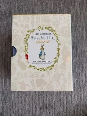 Beatrix Potter boxed set featuring The Complete Peter Rabbit Library in a cheerful yellow. Beautifully illustrated collectible books that brighten a child's shelf. Perfect for gifting and shared reading, with charming classic stories and colorful spines.