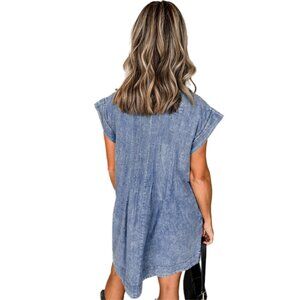 Step out in effortless style with this vintage-wash denim shift dress! Featuring delicate pleated tucking, a flattering V-neckline with tie detail, and a breezy, relaxed fit, this piece is perfect for sunny days and casual outings.