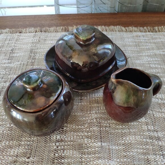 Beauce Art Pottery Set of 3 Marbled Drip Glazed, VTG Butter Dish Sugar Creamer
