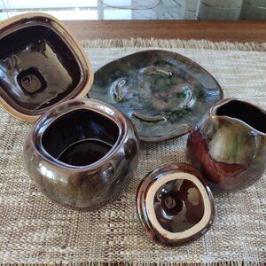 Set of 3, Canadian Studio Art Pottery Beauce Canada Coffee or Tea Service, includes lidded Sugar container, Creamer and Dome Square Butter Dish. Marbled Brown with Green Drip Glaze. Very Good Condition, no chips no cracks, some wear on Butter dish, shown in pictures. Butter dish 6.75 inches square and 4 inches in height, Creamer 4 inches in height and width to handle and 3 inches deep, Sugar Container 3.75 inches in height and 4 inches in depth and width. Please see pictures for further details