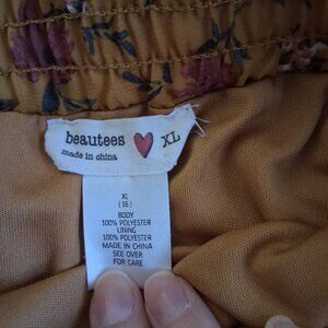 -Color: Rich mustard/ochre yellow brown base (rust) with an all over print of pink/magenta and green flowers