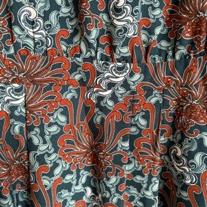 Background colour is green with the pattern being white, rust and a lighter green colour.