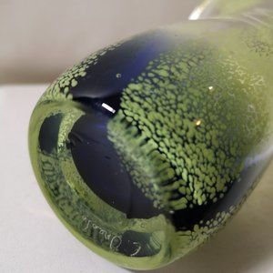 Beautiful Artist Signed Tulip Shape Glass Art Vase Green w Purple-Blue