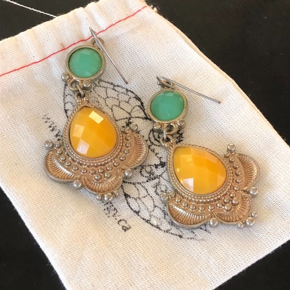 Lightweight but full of impact. These gold toned drop earrings with yellow and turquoise stone. Super comfortable to wear.