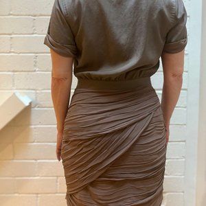 Gorgeous SILK dress in a light, warm brown. A slight cinched waist that flatters the figure and a beautiful flowy midsection.
