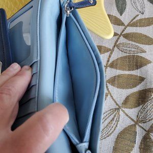 This is a gorgeous Coach wallet. Madison Metallic Leather Trifold Wallet in rare blue with silver hardware. Lots of space for your cash, cards and coins. Exterior back slip pocket. Interior lined in contrasting light blue with multiple slots, slip compartments and a zippered coin pocket. In excellent condition - I carried only 2-3 times. The wallet still feels solid, color and hardware are great, exterior has a few random light scuffs, lining is in excellent, extremely clean condition, coin pocket has a bit of soiling but nothing excessive.
