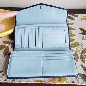 Beautiful Coach MADISON METALLIC Leather Trifold Wallet Blue w/Silver Hardware