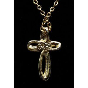 Beautiful cross chain necklace. Cross is nicely decorated with a pattern of white/clear and light blue stones. There is a signature on the back, but I can't really make it out. Chain is 17" long and cross measures 3/4" x 1/2". Excellent condition.