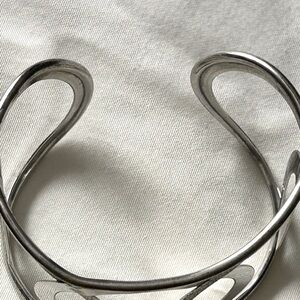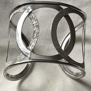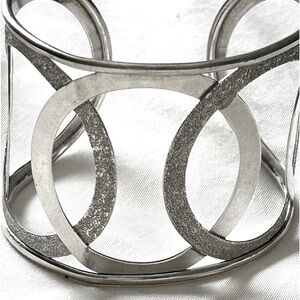 Make a chic statement with this stunning silver-tone open cuff bracelet, featuring bold overlapping circle cutouts in a sleek, structured design. A perfect blend of modern minimalism and sculptural flair.