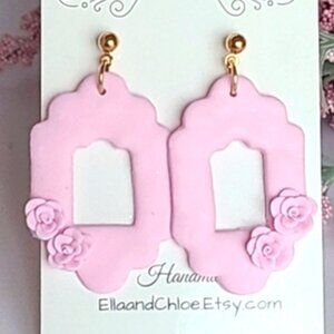 Beautiful Handmade Clay Pastel Dusty Light Pink Floral Flower Gold Tone Drop Statement Earrings