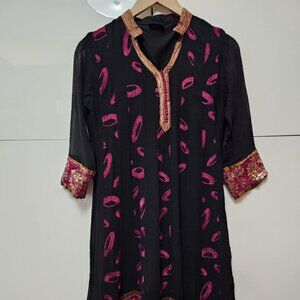 This is a stylish kurta set with a bold black base and vivid pink abstract designs, accented with intricate embroidery. The neckline and sleeve cuffs feature golden and pink embellishments, adding a rich and elegant touch. The hemline is detailed with ornate pink and gold embroidery, enhancing its traditional appeal.