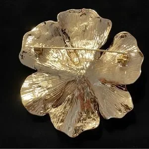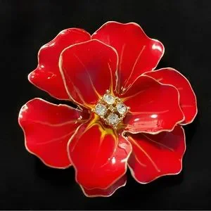 This Beautiful Large Red Enamel Flower Brooch is a stunning piece of jewelry that is sure to catch the eye. The bright red enamel petals are accented with sparkling crystals in the center, creating a bold and glamorous look.