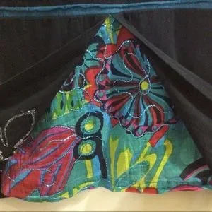 Black base with colourful fabric sewn on top as well as at the front underneath the two side flaps.