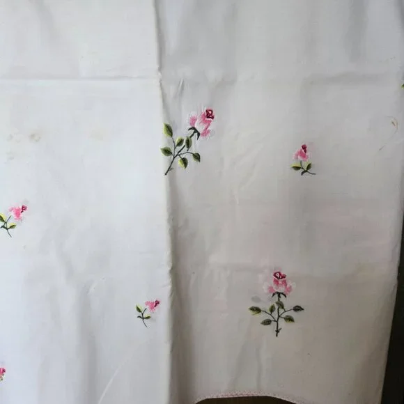 Gorgeous, long, and hand-embroidered Tablecloth with roses all over in light rose and pink with green leaves. The colors are just beautiful.