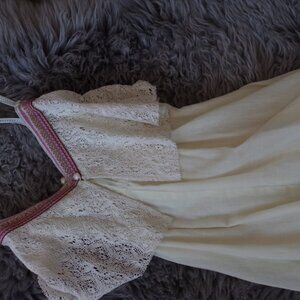Beautiful Long summer cream color dress by The Clothing Company,size mediumm,pit to pit is 161/2 inches.Has delicate lace and cute buttons,with spagetti straps,cute pearl buttons .The dress is 100% cotton,has a liner,size medium.