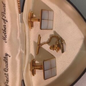 Beautiful MOP Cufflink Set with Tie Pin. Comes in original Box. The square Cufflinks measure .75"x.75"