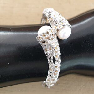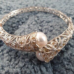 Beautiful Natural Yellow Sapphire Pearl Sterling Silver Filigree Bangle Bracelet