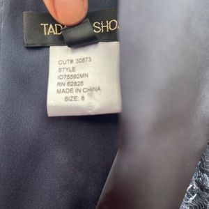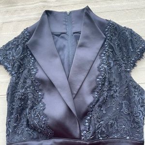 Tadashi Shoji navy blue dress made of satin peau-de-soi, which gives it a luxurious lustre rather than a satiny shine. The satin is banded and has stretch to make for a beautiful fit. The bodice has a satin collar and lapels with the rest being a beautiful beaded lace. The cap sleeves edges are finished in eyelash lace.