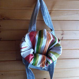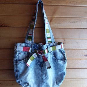 This bag is one of a kind and made by a special friend of mine. It is made from a pair of jeans!!! Beautifully sewn with the multi colored cloth belt, which can be left on or taken off. Accent colors are: white, red, olive green, green, orange and brown. This bag is so cool!!! It is very functional as you have all the pockets of the jeans to put many items in. Dimensions of the bag are: Length of strap from top of bag to shoulder 9", width 12", and length 11". Brand new, never used.
