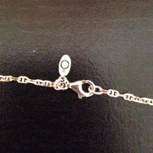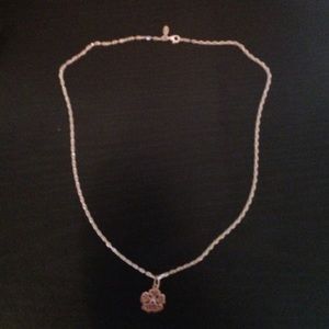This is a new Pandora necklace. It's silver and the flower charm has a purple stone in the center as shown.