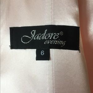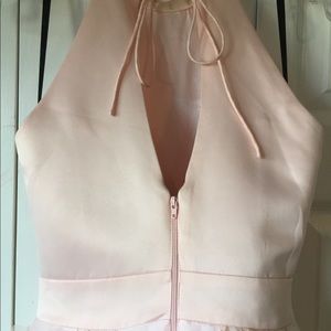 High collar satin dress with floral detail on skirt. Minor pilling on right side of bust. Pastel pink. Adjustable neck. Will ship with garment bag.
