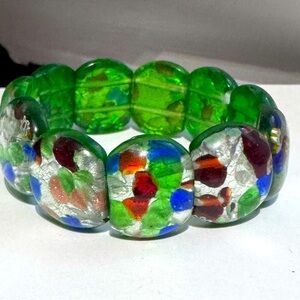 💫 Beautiful Rare Murano Glass Green, Silver Fleck Tutti-Frutti Elastic Bracelet