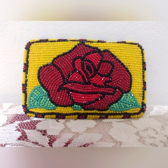 This stunning belt buckle was beaded with small Sparkling Charlotte beads that shimmer and reflect the light, featuring a beautiful red rose πΉ with a yellow background