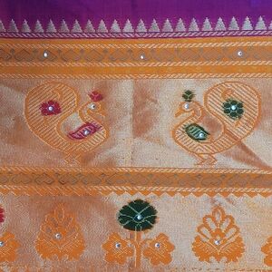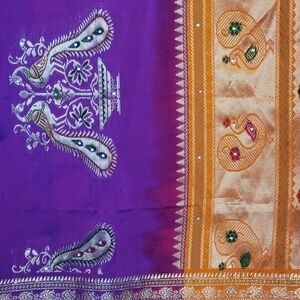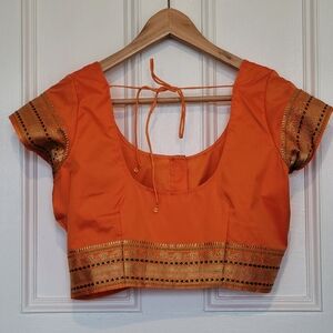 Beautiful shimmering purple and orange sari with matching orange blouse. Embellished with gold thread detail and rhinestones. Includes a matching purple slip with drawstring waist. Worn once.