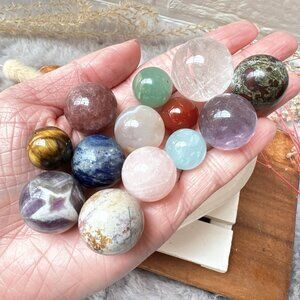 ♥ this is a set with tiny/mini spheres, measure approximately 16~24mm and include: chevron amethyst, strawberry quartz, amethyst, flower agate, tiger eye, dragon bloodstone, ocean jasper, rose quartz, carnelian, aquamarine, sodalite, clear quartz, and green aventurine