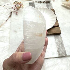 ♥ selenite bowl measures approximately 107x102mm - selenite is a very soft stone and this bowl will contain imperfections, visible lines, and cracks