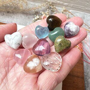 ♥ this is a set with tiny/mini crystal hearts, measure approximately 13~16mm and include: clear quartz, green aventurine, aquamarine, howlite, unakite, rutilated quartz, tiger eye, rose quartz, fluorite, amethyst, and flower agate