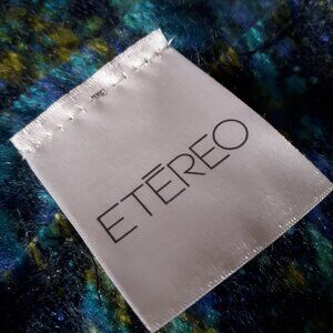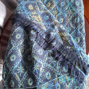 Stunning Shawl by Etereo in vivid colors of Turquoise, Green, Blue. (The camera has washed it out but you can see the actual strong colors by the tag photos). Measures approx. 78 inches long with a one inch fringe at each end and 21 1/2 inches wide. Very soft. 60% Acrylic. 40% Polyester.
