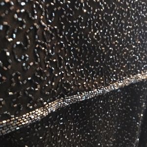 You'll love it. It is black but there is a slight dark blue tone to the overall beading which brings out the classic sparkle. Party Outfit- Could wear the top with jeans for glam look or the skirt with a black turtle.