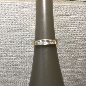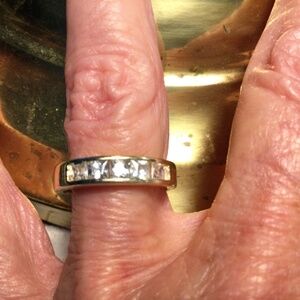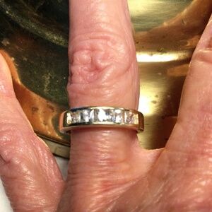 Beautiful solid gold 10k ring. This beautiful band has 5 lovely white sapphires. Solid thick band has nice weight to it, and has lovely sparkle to it. Ring is size 7 & 3/4.