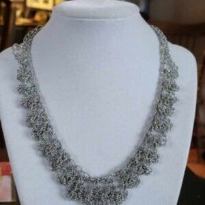 Beautiful, rare & unique vintage fully micro beaded necklace. This has a delicate and lace look to it. Very exceptional and detailed work. This is an amazing piece that can add so much any to outfit, dress. I loved wearing this to Christmas outings, weddings & art auctions years ago. Expect to receive many compliments about this lovely piece. I purchased this from an antique & vintage dealer years ago. I have found several variations of this, but few with such fine detail. The beads are Sterling Silver plated. Overall piece is 19" with Microbeaded portion 13 1/2". The extension is 2 1/2" with an additional 3" (1 1/2 per side) chain.