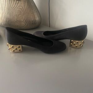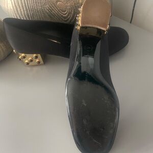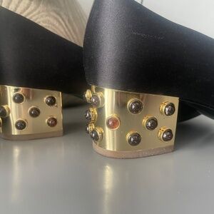 Beautiful black Silk Stella McCartney Shoes size 39 for women. Gold metal heels with embedded black stones. Worn only once indoors. Very comfortable and in brand new condition. Made in Italy.