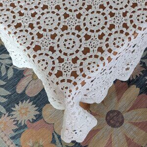 Here is a lovely vintage white lace tablecloth - rectangular 48 x 70 inches. It is appears to have been machined made and it is in excellent condition. The design is of circular motifs, and the hem is scalloped.
