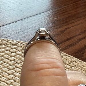 This set is made with 18 karat, white gold, and South African diamonds! Originally purchased in South Africa. The engagement ring has one round .3 carat diamond of H colour and SL 1 clarity and has 12 round diamonds, .18 karats of DEF Colour and SL clarity. The wedding band has 14 round diamonds, .21 karats of DEF Colour and SL clarity. Valued at $3959 cnd.