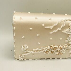 Made in Hong Kong beautiful white and cream beaded clutch. Silk like fabric covering and white beads and white and light bronze pearl beads.