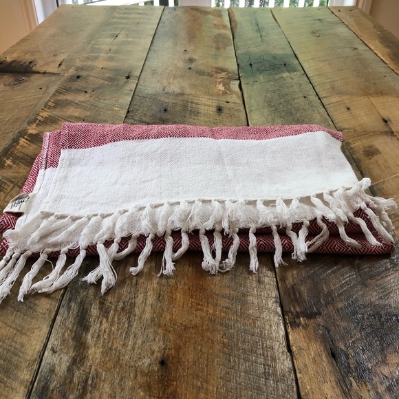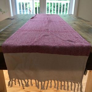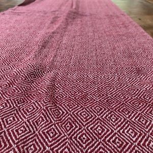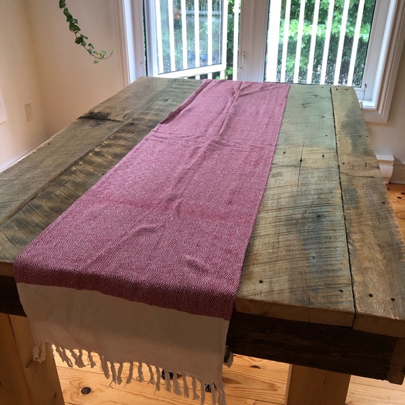 Like new red and white table runner by Stitch and Shuttle. Beautiful woven red diamond pattern and white tassels at the ends. Only used a couple of times.