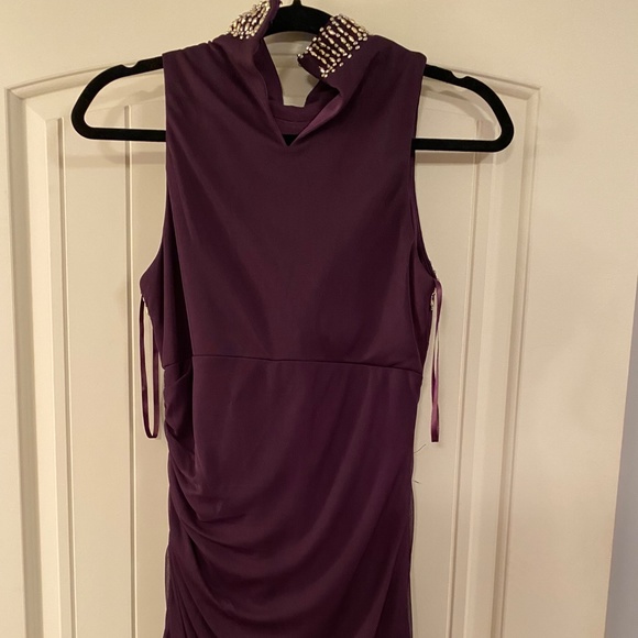Gorgeous chiffon eggplant beaded stretchy dress. Size 10 (fits small). Very sexy knee length or a bit above. It’s very flattering - side ruffle. New with tag. A few beads missing at the very back by the closure but you can’t see it once it’s done up.