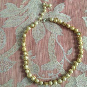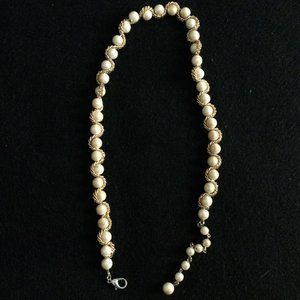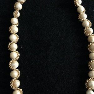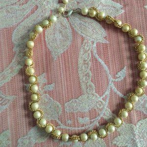 It is a beautiful beaded and gold tone wire-wrapped necklace, 16-18" long, and in good used condition.