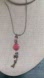 Necklace wth delicate pendant that features a small light pink shell disk and a cluster of tiny pink pearl and metal beads.