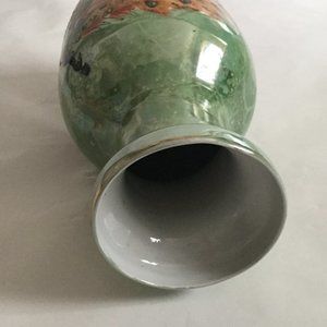 Beautiful ceramic vase green luster ware floral pink flower peacock 12" tall