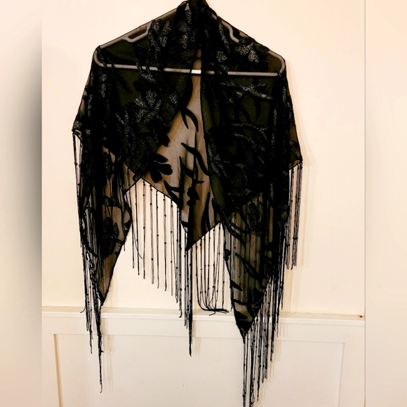 Beautiful large triangular scarf or wrap. Black, with shimmery silver threads and Ling knotted fringe. Perfect to go with that little black dress for thar Christmas party.