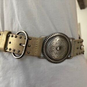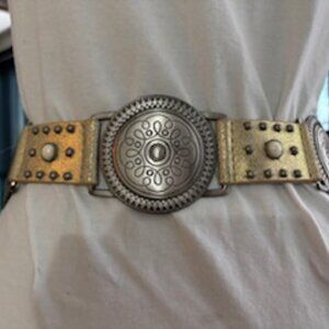Beautiful goldish leather belt with silver conches. Very stylish !!