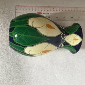 Beautiful pottery vase blue with green yellow leaves white flowers 7 1/4" tall
