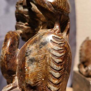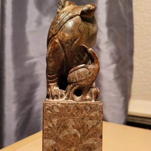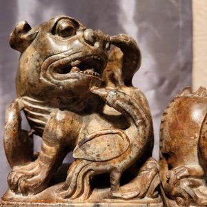 Standing at a tall 7 1/2" these stunning Foo dogs are absolutely beautifully detailed. The base is carved as well. Just so much attention to detail including the three cranes (one that sits atop the back of the Foo dog on one is missing, but the other is fully intact). While on some items this would be problematic, on these it shows the age and the historical value that these have. Even the teeth of the dogs are visible. Exceptional craftsmanship in these. Not cookie cutter by any stretch of the imagination. On the one with the three birds, one ear has been chipped, but again, not really an issue. If you are a collector, these are sincerely a must have. The weight is about 9 lbs overall. I would guesstimate their age to be possibly 19th or even earlier? I cannot and will not guarantee that, an expert would have to do that, but I know that their age is significant. I have been considering listing them on 1stDibs, but will try this first.