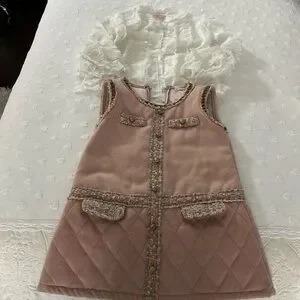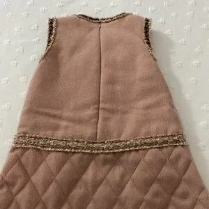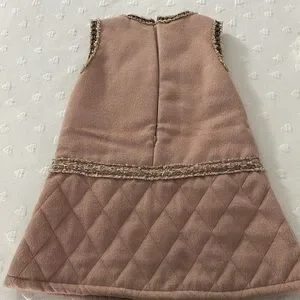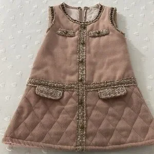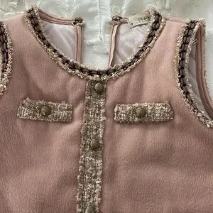 Dress is in dusty pink colour with tweet decor. Chanel style.